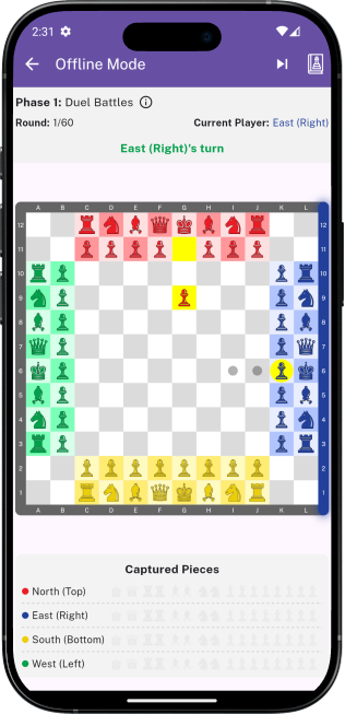 Built on a 12×12 board with dynamic zones, Quantum Chess unfolds through seven distinct phases, each designed to shrink the board, intensify the pressure, and eliminate indecision. From duel-only captures to forced pawn promotions, board collapse, and a sudden death overtime, the game is engineered to eliminate stalling and guarantee a definitive winner.